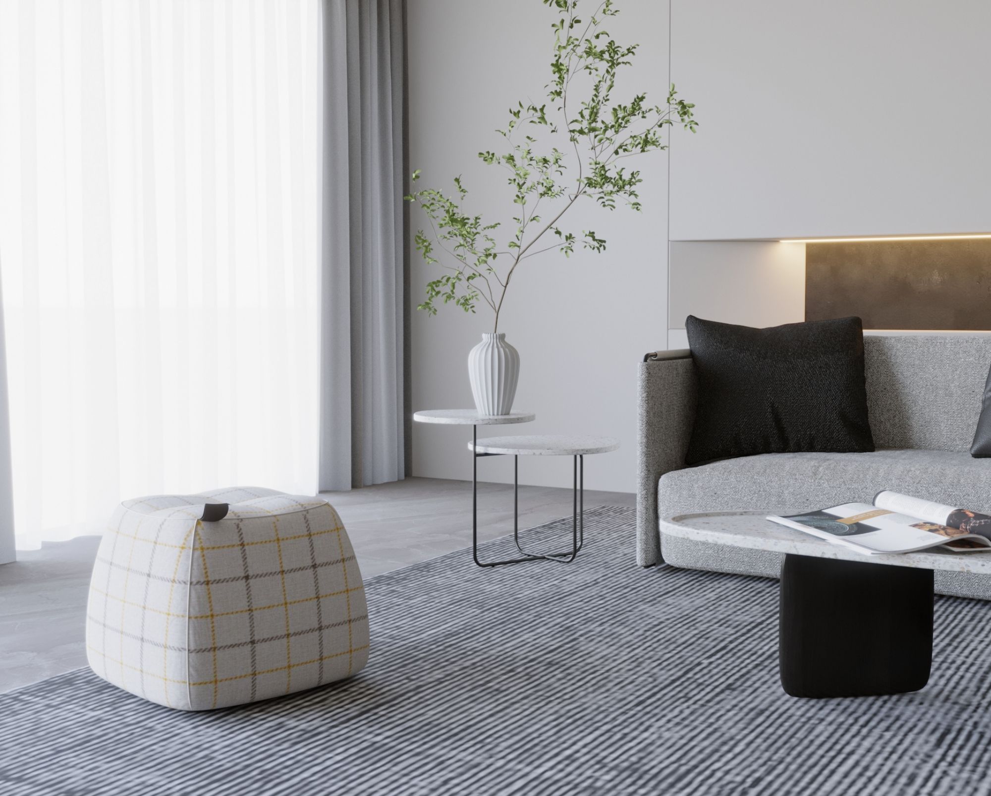 Thiết kế hiện đại, sang trọng: Đôn Fonect nổi bật với họa tiết kẻ ô thanh lịch và gam màu trung tính, dễ dàng phù hợp với mọi không gian nội thất, từ phòng khách, phòng ngủ đến văn phòng.